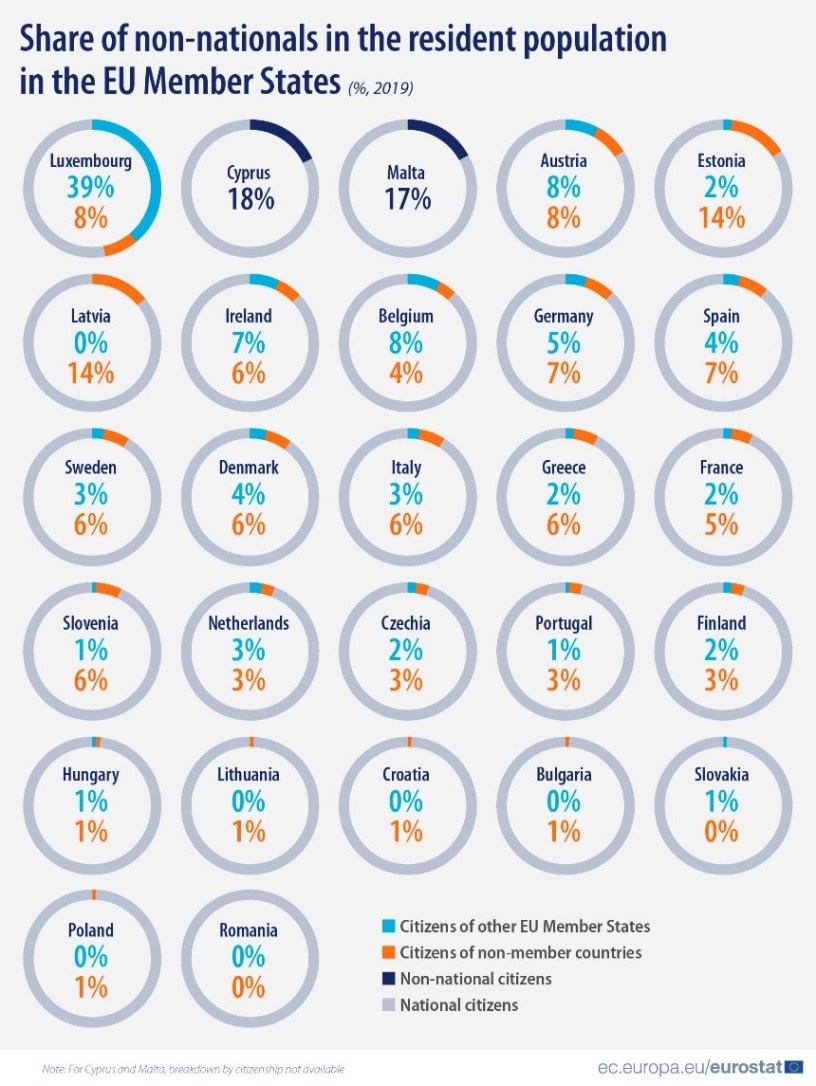 En 2019, le Luxembourg était le pays où sa population comptait le plus de non-nationaux en Europe, selon Eurostat.