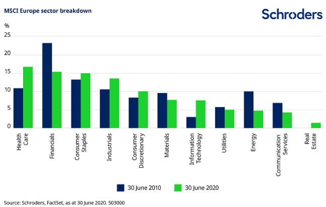 La composition sectorielle européenne a fortement évolué au cours des dix dernières années. La pondération de l’énergie et des services financiers a chuté de 33 % à 20 % pendant que les soins de santé devenaient le principal secteur et que la pondération de la technologie doublait. Cela devrait modifier l’idée préconçue d’une Europe en manque de leaders de marché innovants.