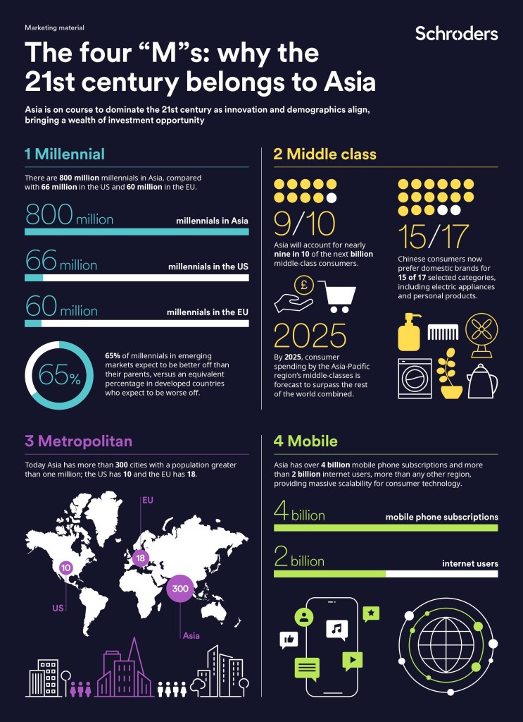 La Chine et l’Inde sont les deux pays les plus densément peuplés du monde qui connaissent « une dynamique qui façonnera le 21e siècle », affirme Viswanathan Parameswar, responsable des investissements en Asie chez Schroder Adveq. Pour lui, les consommateurs asiatiques sont caractérisés par les quatre « M ». A savoir : milléniaux, classe moyenne, métropole et mobile. Ces derniers détermineront l’avenir de l’Asie.