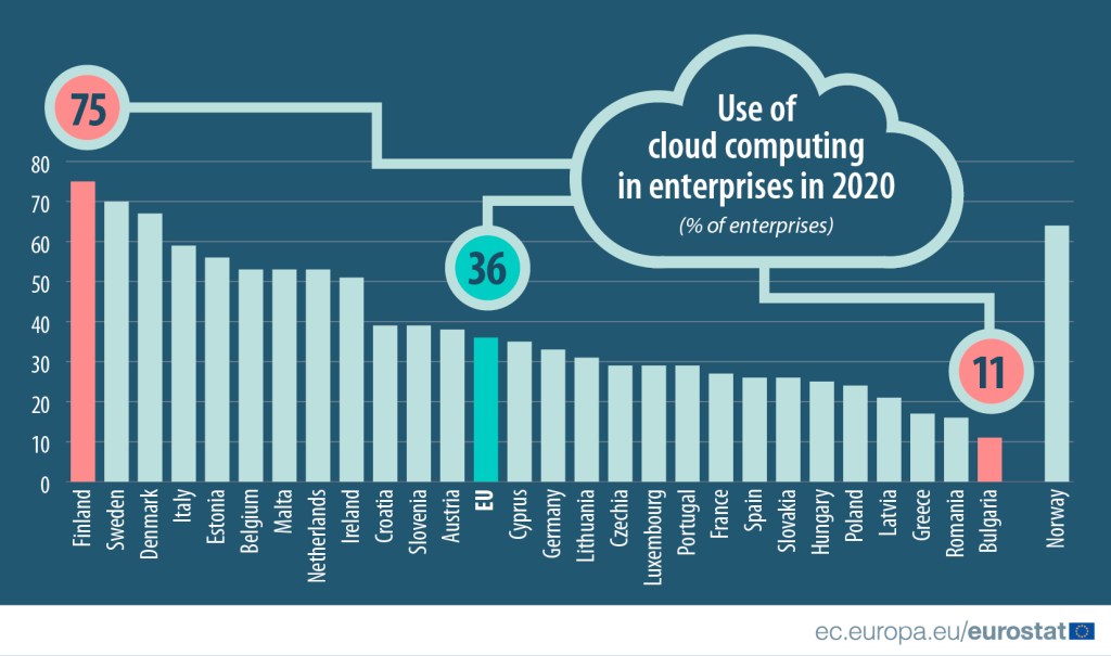 Bien que la proportion d’entreprises ayant un accès à l’internet soit très similaire dans tous les États membres de l’UE, l’utilisation du cloud computing varie considérablement, les parts les plus élevées étant signalées en Finlande (75 %), en Suède (70 %) et au Danemark (67 %) en 2020.