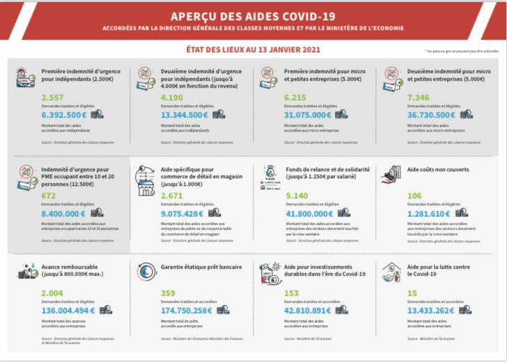 D’autres informations intéressantes autant pour les entreprises que pour les citoyens y figurent comme par exemple, le nombre de demandes traitées et accordées pour la garantie étatique prêt bancaire (359) et le nombre de personnes réellement concernées par le chômage partiel au 13 janvier 2021, soit 375 196.