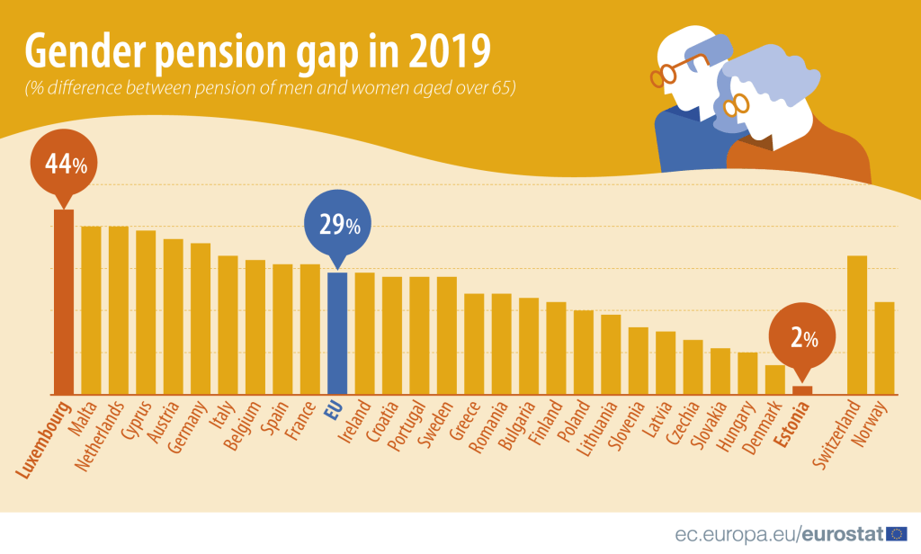 Selon une récente publication d’Eurostat, au Luxembourg en 2019, l’écart de pension entre hommes et femmes est de 44%. Il s’agit du plus important en Europe.