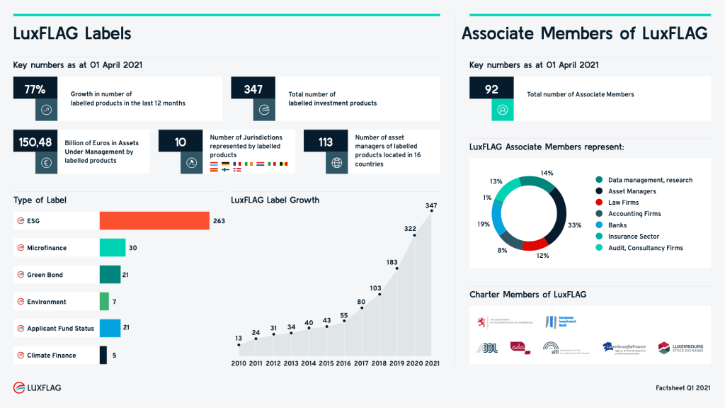 LuxFLAG a annoncé cette semaine que 27 fonds (18 ESG, 5 ESG Applicant Fund Status, 1 Environment, 2 Environment Applicant Fund Status et 1 Microfinance) ont obtenu le label LuxFLAG, portant le nouveau total à 347 produits d’investissement avec 150,48 milliards d’euros d’actifs sous gestion au 1er avril 2021.