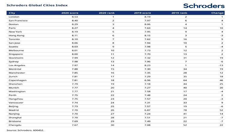 Cette progression, explique le communiqué de Schroders, est due exclusivement à son score élevé en matière de transports, les variations pour les autres facteurs (économie, innovation, environnement) par rapport à 2019 étant négligeables.