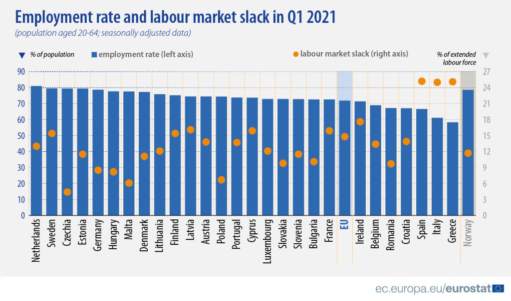 Au niveau de l’Union européenne, le taux d’emploi corrigé des variations saisonnières des personnes âgées de 20 à 64 ans s’est établi à 71,9 %. Eurostat précise également que le déficit du marché du travail, qui comprend toutes les personnes dont le besoin d’emploi n’est pas satisfait, s’élevait à 14,8 % de la population active étendue âgée de 20 à 64 ans au premier trimestre 2021.