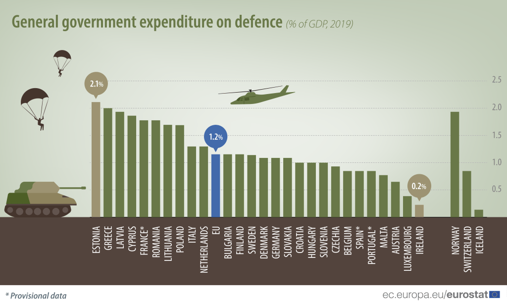 En 2019, le Luxembourg a dépensé 0,4% de son PIB, en matière de défense. D’après Eurostat, il a avec l’Irlande (0,2%) le ratio des dépenses publiques de défense au PIB le plus faible de l’Union européenne.