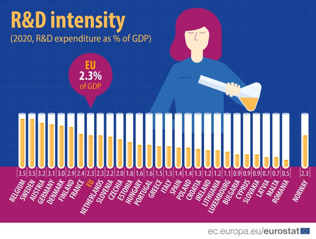 L’an passé, les États membres de l’UE ont dépensé environ 311 milliards d’euros en recherche et développement (R&D). Il s’agit d’une diminution de 1 milliard d’euros par rapport à 2019 (312 milliards d’euros). L’intensité de la R&D, c’est-à-dire les dépenses de R&D en pourcentage du PIB, s’est établie à 2,3 % en 2020, contre 2,2 % en 2019. « Toutefois, cette faible augmentation est due à une diminution du PIB en raison de la pandémie de COVID-19. Dix ans plus tôt (2010), l’intensité de la R&D était de 2% », note Eurostat.