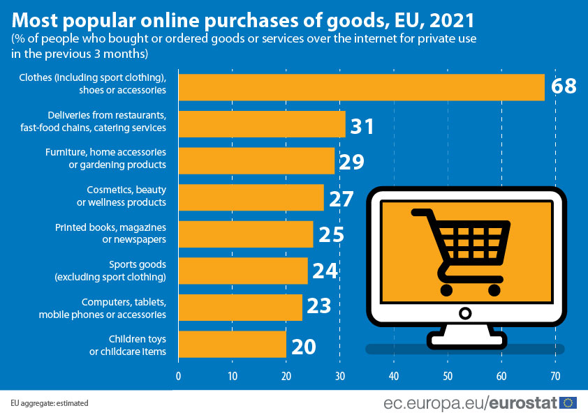 Au niveau de l’Union européenne, 74% des personnes interrogées se sont servies du Net dans cette objectif. Les achats en ligne ont augmenté de 1 point de pourcentage (pp) par rapport à 2020 (73% des internautes) et de 11 pp par rapport à 2016 (63%).
