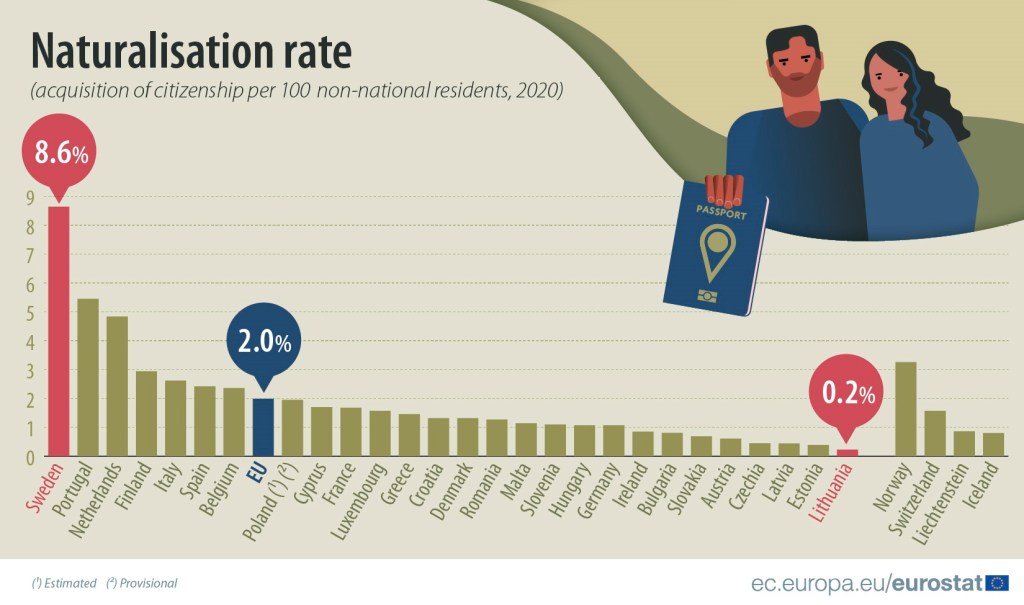 En 2020, selon une étude d’Eurostat, les taux les plus élevés de naturalisation des citoyens ont été observés en Suède, au Portugal et aux Pays-Bas.