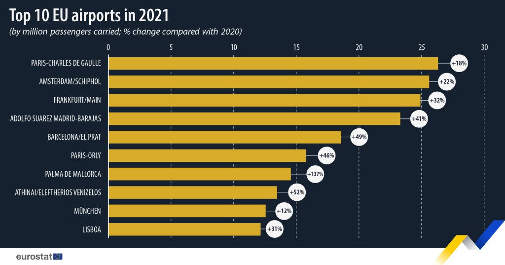 On prend les mêmes et on recommence. En 2021, l’aéroport de Paris-Charles-de-Gaule était le plus fréquenté de l’Union européenne avec 26,2 millions de passagers, selon une étude d‘Eurostat publiée ce mercredi. Suivent celui d’Amsterdam-Schiphol (25,5 millions), Francfort/Main (24,8 millions), Madrid-Barajas (23,2 millions) et Barcelone-El Prat (18,5 millions).