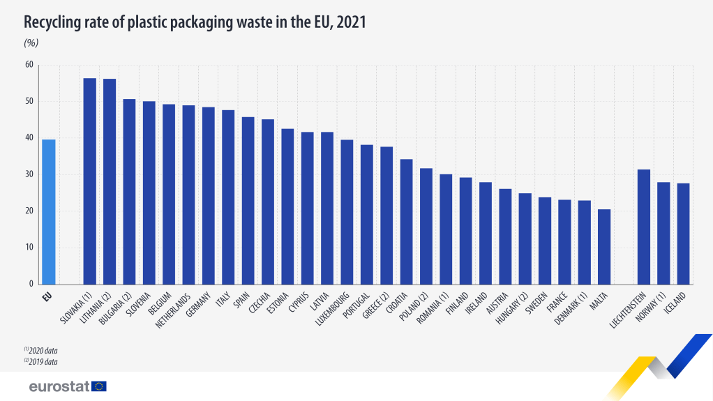 C’est le pourcentage d’emballages plastiques recyclés au Luxembourg en 2021, selon une récente étude d’Eurostat. Le pays est juste en dessous de la moyenne européenne (39,7%). Le taux est beaucoup élevé en Slovénie, Belgique et aux Pays-Bas avec respectivement 50, 49,2 et 48,9%. En revanche, moins d’un quart des déchets ont été recyclés à Malte (20,5 %), en France (23,1 %) et en Suède (23,8 %).