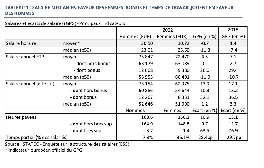 Ici, comme dans de nombreux pays dans le monde, l’écart salarial entre les deux sexes demeure un problème. En 2024, le Statec, l’institut national de la statistique, révélait qu’en 2022, le Gender Pay Gap ( l’écart entre le salaire horaire brut moyen des hommes et celui des femmes -GPG) était de -0.2%. Ce chiffre est faible par rapport à ceux des voisins (17,7 % en Allemagne, 13,9 % en France et 5 % en Belgique). En moyenne européenne, le GPG se situe à 12,7 %.