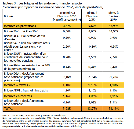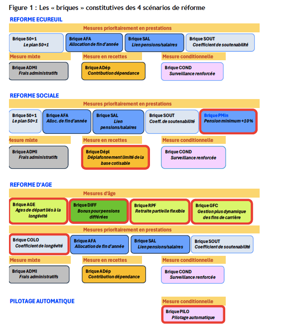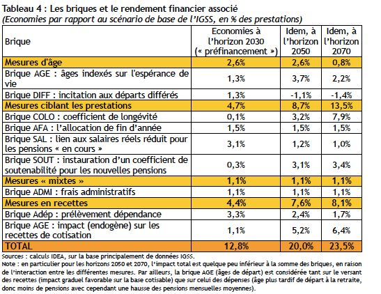 La première d’entre elles a été nommée « réforme Ecureuil ». Elle se base sur le préfinancement, privilégie l’épargne (d’où son nom) et vise la « restauration » de l’équilibre financier à moyen terme du régime général des pensions, tout en intégrant des mesures sociales. A titre d’exemple, l’allocation de fin d’année versée à tous les pensionnés serait limitée en 2027 pour les grosses pensions. Mais ce qu’il faut retenir, c’est que la progression future de la pension moyenne serait freinée pour réaliser des économies, tout en préservant les petites pensions et en « écrémant » les plus élevées. S’ajouterait une prise en charge par l’État des frais administratifs de la Caisse nationale d’assurance-pension (CNAP) et du côté des recettes, une hausse de la cotisation dépendance. Cela permettrait à l’État de financer un accroissement de ses transferts vers le régime général. Cette réforme est constituée de différentes « briques » comme des Lego qui peuvent être assemblées selon les besoins rencontrés.