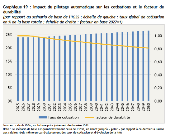La dernière piste qui n’est pas une réforme serait d’activer « le pilotage automatique ». Ce dernier repose sur une seule mesure : l’intégration à la formule de calcul de pension d’un facteur de durabilité qui vise à assurer l’équilibre financier du régime général. « Fixé à 1 en 2027, celui-ci évoluerait ensuite en fonction de la situation financière du système de pensions ». Seul hic : il donne lieu à une diminution de la pension pour une personne qui part à la retraite en 2052 (par rapport à la politique inchangée). Il y aurait d’après l’auteur de l’étude, des « amortisseurs à prévoir », à savoir des réunions tripartites (gouvernement, patronat, syndicat) en cas de besoin. Ce « pilotage automatique » serait intéressant comme ingrédient potentiel pour d’autres réformes.