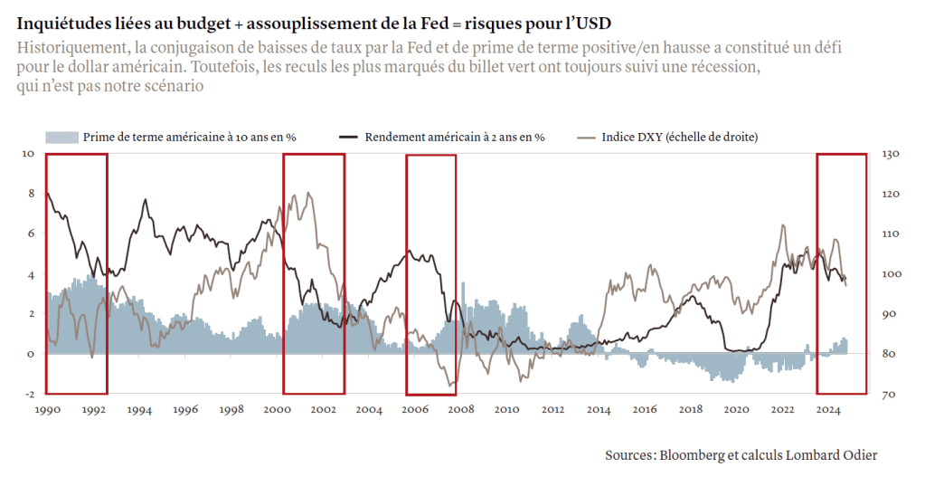 Historiquement, des primes de terme plus élevées conjuguées à des anticipations de baisse des taux des fonds fédéraux ont coïncidé avec des phases de dépréciation du dollar, reflétant à la fois des préoccupations croissantes à l’égard de la politique budgétaire et un ralentissement économique, ainsi qu’un différentiel de taux moins favorable pour le dollar.