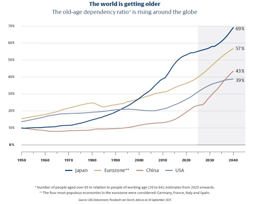 Du point de vue de la stratégie d’investissement, il est essentiel de noter que les vents contraires démographiques touchent principalement les économies qui affichent le pouvoir d’achat le plus élevé selon les normes internationales. En conséquence, les entreprises qui ont bénéficié à la fois de la croissance démographique et de la prospérité croissante perdent désormais au moins une partie de cet élan. Même si ces pressions ne conduiront pas nécessairement à un déclin de l’activité, les entreprises concernées seront confrontées à des défis plus importants à l’avenir pour stimuler la croissance par leurs propres moyens, par exemple en innovant davantage ou en différenciant leurs gammes de produits.