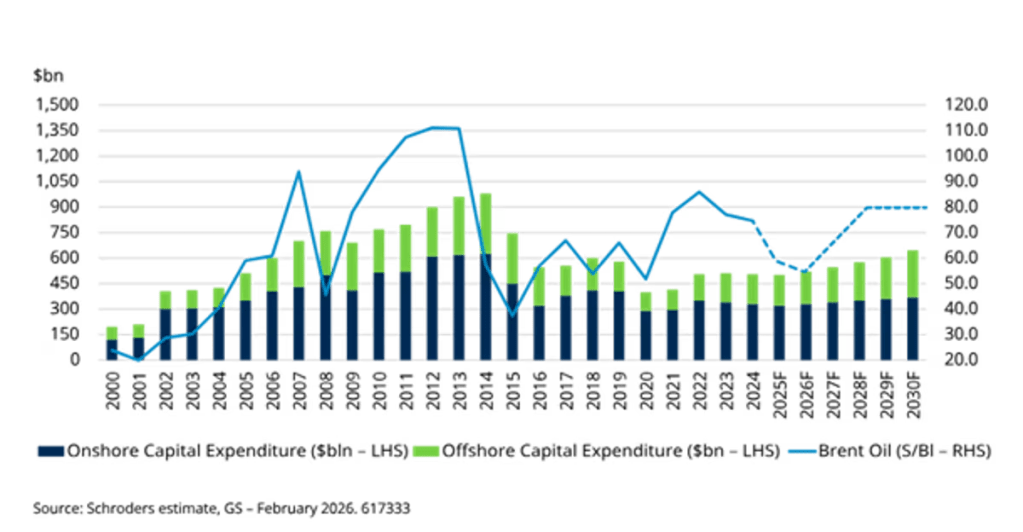 There were signs that available oil supplies were likely to fall short even before the current conflict in the Middle East threatened unprecedented disruption. Energy equities remain underrepresented in global indices. If capital allocation to the sector increases during a sustained investment cycle, stronger earnings and improved sentiment could support share prices.